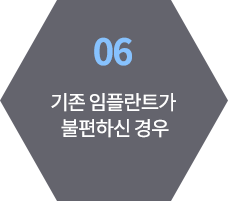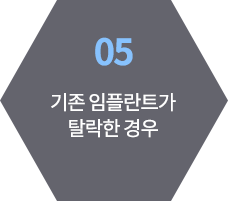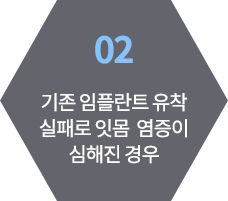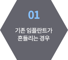 임플란트는 자연치아와 다르게 충치가 생기지 않기 때문에 반영구적으로 사용 할 수 있다고 알려져 있지만 사후관리나 임플란트를 식립하는 단계에서 문제가 발생하여 기존 임플란트를 제거하고 정밀한 분석으로 근본적인 원인을 판단하여 실패한 임플란트를 재수술하여 치아건강을 되찾는 시술입니다.